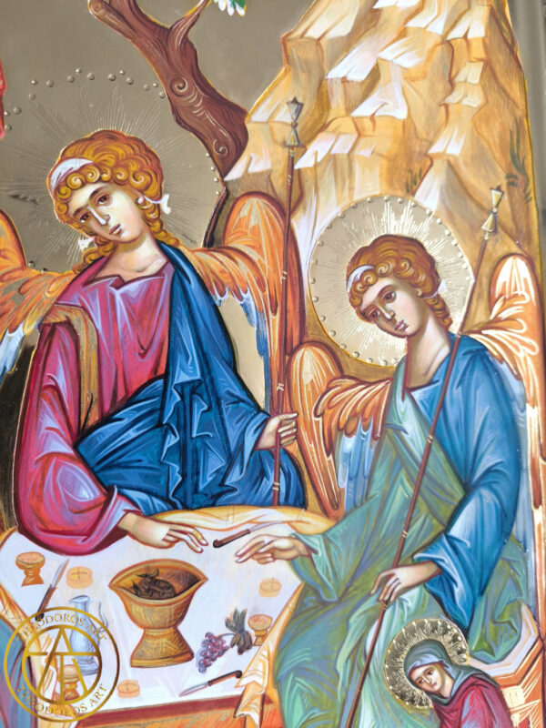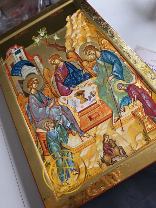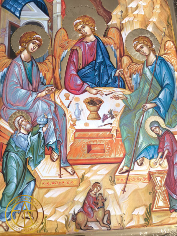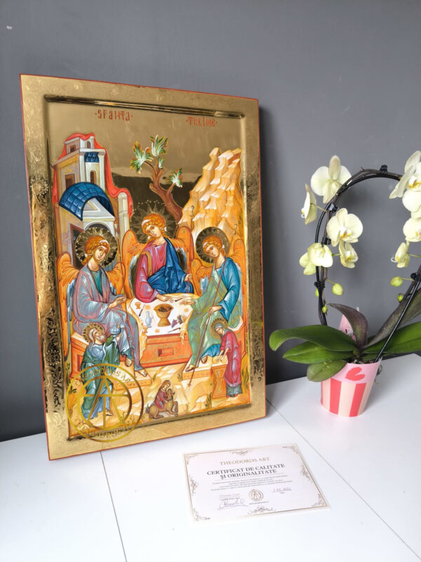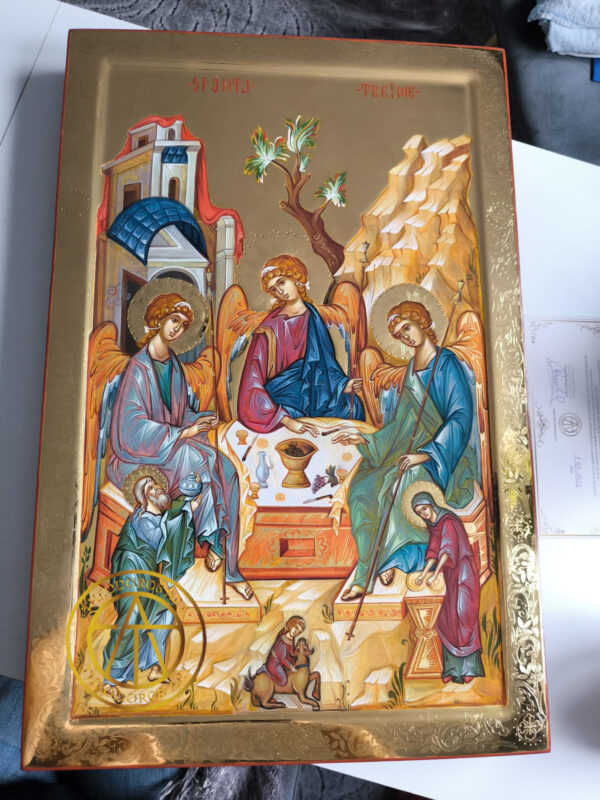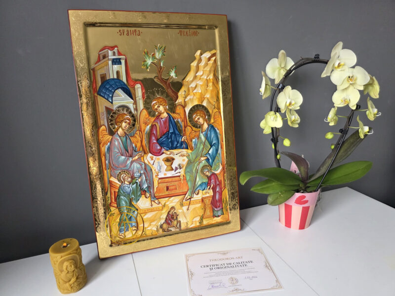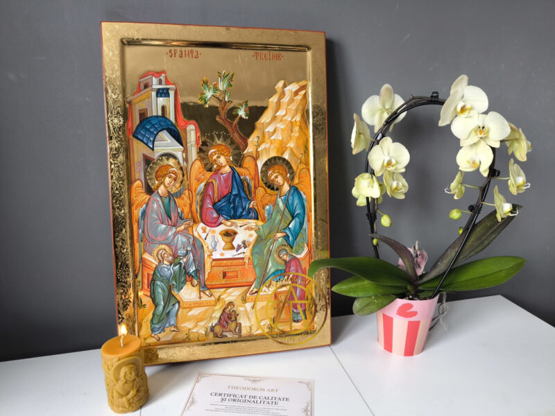 Sfanta Treime-Icoana realizată în stil bizantin tradițional, pe lemn natural, cu aurire realizată în tehnica Bolus și aur de 23,7 karate cu modele gravate in aur .Dimensiune 60×40