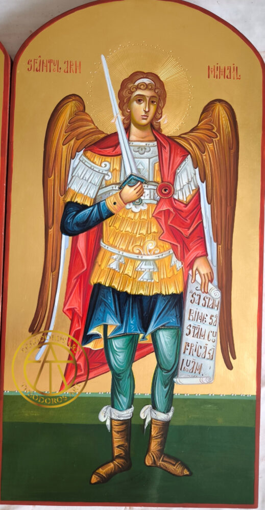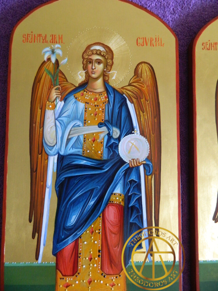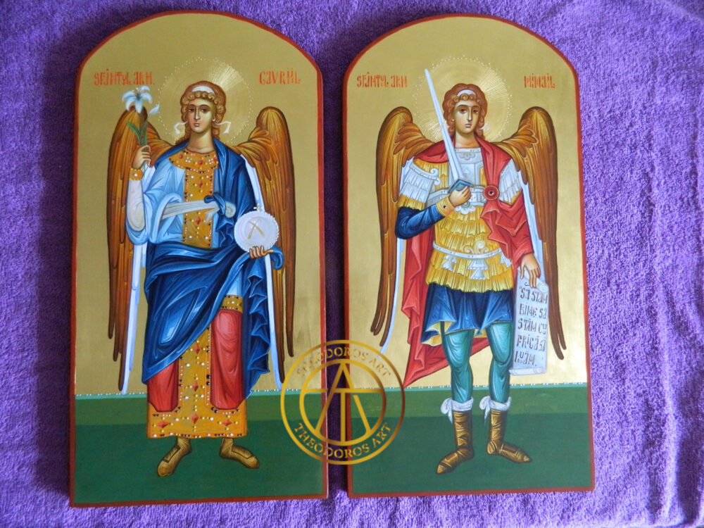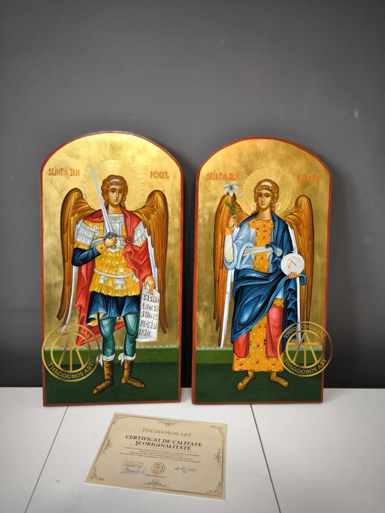 Sfintii Arhangheli Mihail si Gavriil (usi diaconesti) -Icoana realizată  în stil bizantin tradițional, pe lemn natural, cu aurire  realizată în tehnica Mata și  aur de 23,7 karate.  .Dimensiune 50×25