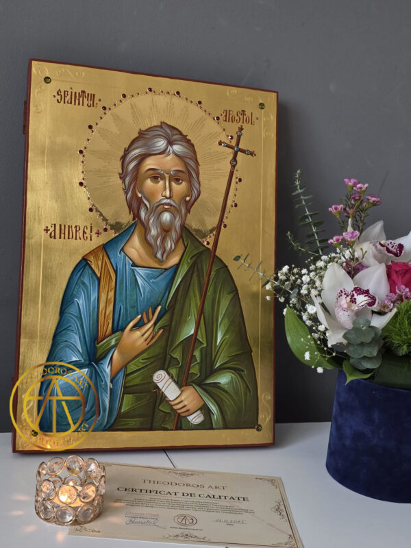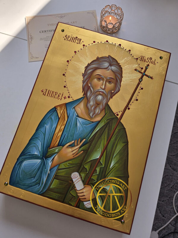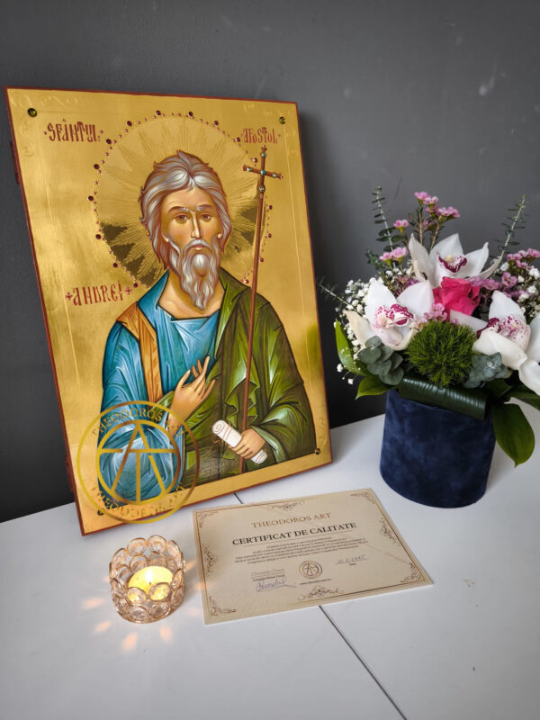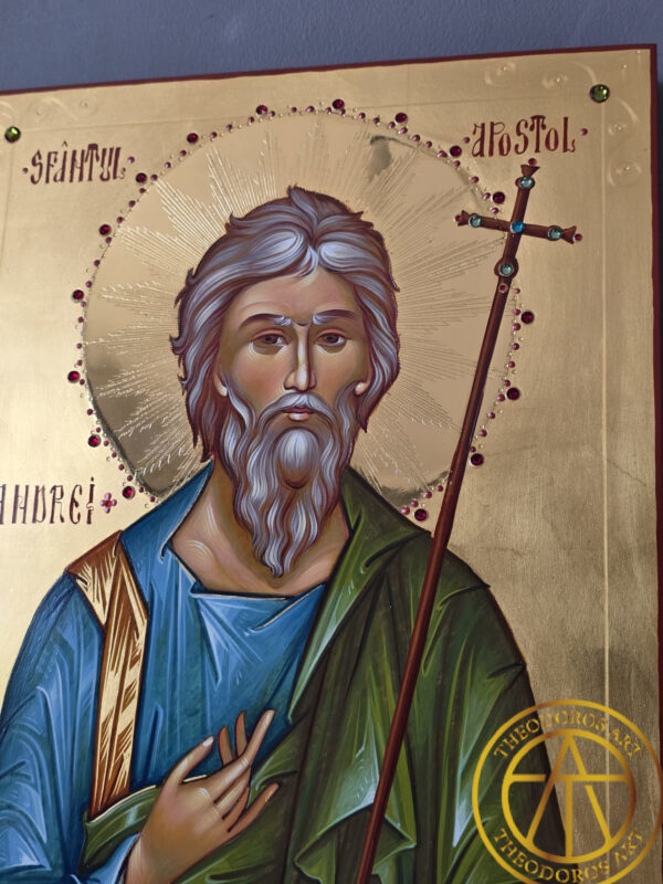 Sfantul Apostol Andrei -Icoana realizată  în stil bizantin tradițional, pe lemn natural, cu aurire  realizată în tehnica mixta și  aur de 23,7 karate cu modele gravate in aur si cristale swarovski .Dimensiune 42×30